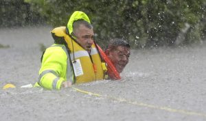 A rescue worker carries two dogs to safety after evacuating their family from floodwaters in Houston, Texas.