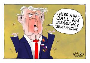 Look at it. The tableau is so absurd it feels storyboarded by Voldemort and Liberace’s real estate LLC. A man collapses on the floor where presidents once ended wars and launched moon missions. Now the room has all the gravitas of a Vegas timeshare bathroom, festooned with Chinese-made American flags marinated in Drakkar Noir. It’s as if history’s most consequential decisions are now being made in the world’s tackiest escape room.
