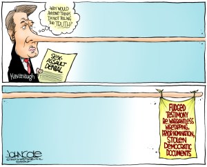 Meanwhile, some Kavanaugh school mates have taken to speaking to the press. It is likely the press finds more than the FBI which may be the one good thing from this brief respite from the Republican ramrod seeking a quick vote. Yale class mate Chad Luddington provided a statement to the NYT documenting Kavanaugh’s ongoing love affair (aka heavy drinking) with beer. We could tell from that display on Thursday that this judge appears to be a raging alcoholic red nose and pink chinks included.