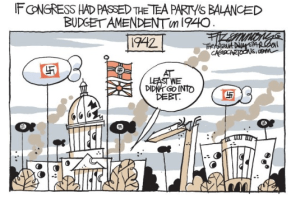 I always have to cover this topic in any introductory macroeconomics class I teach because usually one nutjob or another running for office always brings this up and people fall for it. The arguments are usually based on complete fallacies and misunderstanding of the math of economics, but hey, for some reason balanced budgets sound ‘reasonable’ when they are anything but.