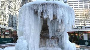 The frozen Josephine Shaw Lowell Memorial Fountain located at Bryant Park in New York is viewed on January 2, 2018 as New Yorkers return back to work after the holiday break. TIMOTHY A. CLARY/AFP/Getty Images