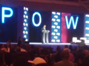 My shot of Senator Bennet. I was in the middle of the room but far away from the stage. Thank goodness for the big screens!!