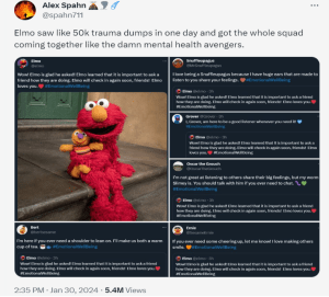 After a few hours of people trauma dumping on the Muppet, the official “Sesame Street” account called time with a follow-up post directing people to — yes, really — mental health resources.