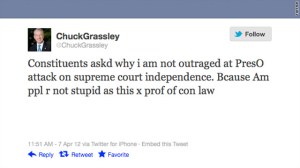 David Axelrod responded: “Heads up, Sen. Grassley. I think a 6-year-old hijacked your account and is sending out foolish Tweets just to embarrass you!” But I like Charlie Pierce’s response better: