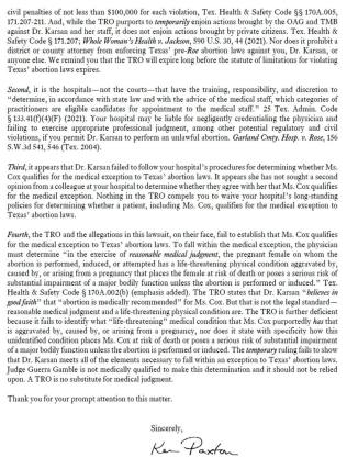 Paxton also wrote that the hospital where Cox obtains an abortion “may be liable for negligent credentialing the physician” who performs the procedure.