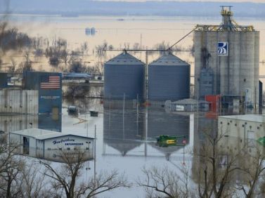 Floodwaters on the southwest side of Hamburg, Iowa, Sunday, March 17, 2019. Residents in parts of southwestern Iowa were forced out of their homes Sunday as a torrent of Missouri River water flowed over and through levees (Photo: RYAN SODERLIN / AP)