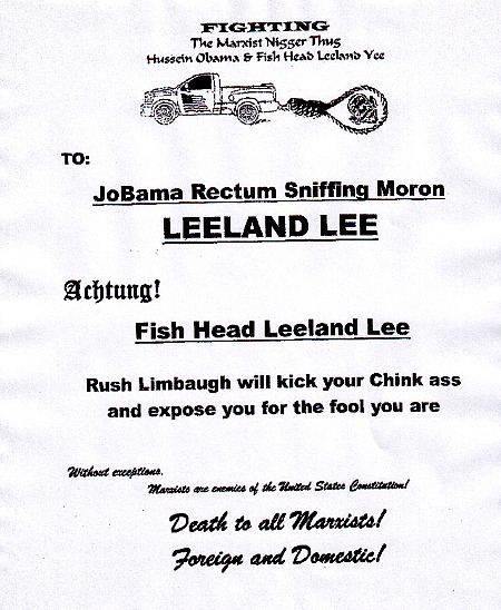 The anonymous faxes, laced with racial epithets and misspellings, were addressed to “JoBama Rectum Sniffing Moron LEELAND LEE” and call Yee a “fish head,” according to a copy provided by Yee’s office.