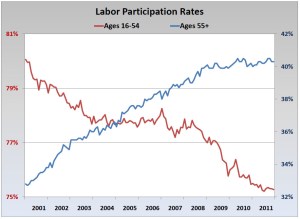I’m still thinking that younger people may be holding up in school for awhile until things get better but I’d have to do some research to see if the university population is up. I also think that there’s the discouraged worker factor too. I actually know a lot of folks that are just hanging in there and cashing in their IRAs or have gone back to school and are living on student loans and or going back and forth between short term jobs and contract work. I guess we’ll see if the trend holds, but to me it’s a worrisome one. If things were really getting better, those folks should be entering the job market now driving the participation rate up. Since I’m a financial economist and not a labor economist, I really don’t know the flows well enough to speculate on anything beyond a theoretical level. It’s not my research area.