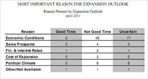 The percent of owners planning capital outlays in the next three to six months fell 3 points to 21 percent, a recession level reading. Money is cheap, but most owners are not interested in a loan to finance equipment they don’t need. Prospects are still uncertain enough to discourage any but the most profitable and promising investments. Four percent characterized the current period as a good time to expand facilities (seasonally adjusted), down 1 point from March and 4 points lower than January. The net percent of owners expecting better business conditions in 6 months slipped another 3 points to negative 8 percent, 18 percentage points worse than in January. Uncertainty is the enemy, and there is plenty of it to convince owners to “keep their powder dry”. Apparently consumers feel much the same way, as more customers spending more money would overcome the reluctance of owners to hire and make capital outlays. One in four still cite “weak sales” as their top business problem.
