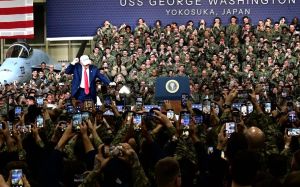 President Donald Trump treated his time in Japan on Tuesday as a victory lap — befriending the new Japanese prime minister, taking her with him as he spoke to U.S. troops aboard an aircraft carrier and then unveiling several major energy and technology projects in America to be funded by Japan.